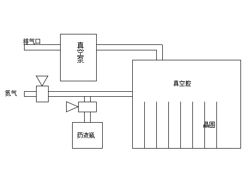 Najprv sa zapne vákuové čerpadlo, aby sa začalo vysávať. Keď úroveň vákua v komore dosiahne nastavenú hodnotu (túto hodnotu je možné nastaviť zmenou hodnoty P2 na vákuomere, pozri návod na vákuomer), zavedie sa dusík. Po dosiahnutí nastavenej úrovne vákua (túto hodnotu je možné nastaviť zmenou hodnoty P1 na vákuometri) sa proces vákuovania a zavádzania dusíka zopakuje. Po dosiahnutí nastaveného počtu prívodov dusíka sa opäť začne vysávanie, po ktorom nasleduje zavedenie chemického roztoku. Po uplynutí nastaveného času sa zavádzanie chemického roztoku zastaví a začne fáza udržiavania. Po uplynutí nastaveného času zdržania začne znovu vysávanie a zavádzanie dusíka na nastavený počet cyklov. Keď systém automaticky dokončí proces, zaznie zvukový a vizuálny alarm, ktorý indikuje, že plátky sú pripravené na odstránenie.