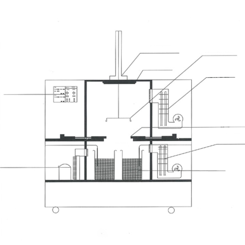 2.4. Vnútorná komora komory soľného spreja je vyrobená z nehrdzavejúcej ocele 316L. Vonkajší plášť využíva dosky z uhlíkovej ocele s povrchovou úpravou striekanou. Nádrž na soľný roztok je vyrobená z nehrdzavejúcej ocele 316L, s vnútorným aj vonkajším povrchom potiahnutým PTFE alebo vyrobeným z PTFE materiálu, aby bola zaistená odolnosť proti korózii. Snímače teploty využívajú vysoko presné platinové odporové snímače triedy A na priame meranie teploty soľného roztoku. Tieto senzory sú úplne zapuzdrené v PTFE, aby sa zabránilo reakcii so soľným roztokom. Vzhľadom na požiadavku na prevádzkovú teplotu 20 °C až 50 °C obsahuje komora na ponorenie soli duálne systémy: chladiaci cyklus a ohrievací cyklus. Ohrievací cyklus využíva rovnakú metódu ako v sušiarňach.